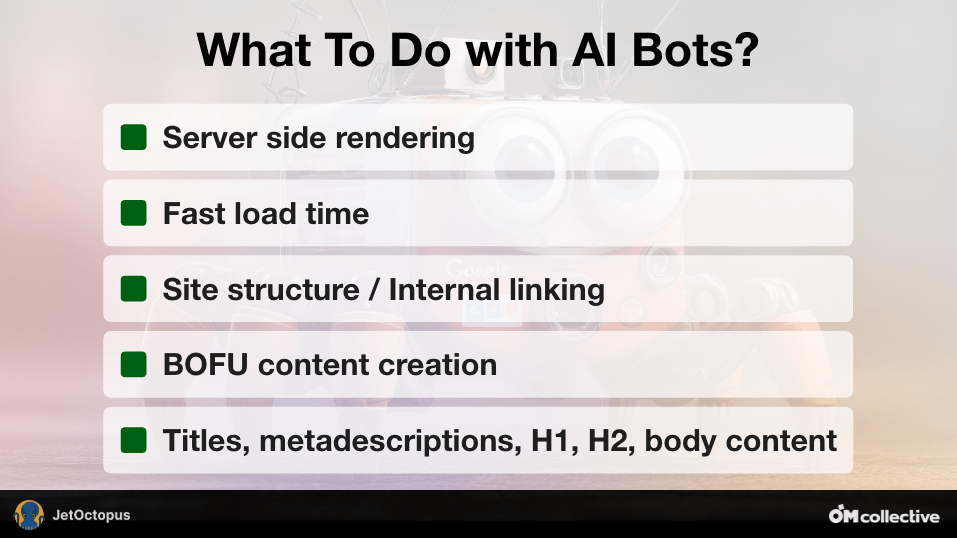 Nieuwe types bots bezoeken je site op hun eigen manier, maar ze willen allemaal hetzelfde: efficiëntie en stabiliteit. Snelle laadtijden, propere HTML en server-side rendering blijven grote impactfactoren.
