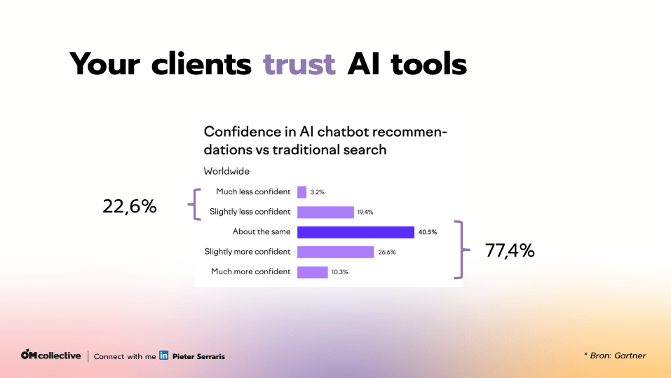 Bovendien hebben mensen een ongelofelijk sterk vertrouwen in AI-antwoorden. Meer dan 77% van de gebruikers zegt evenveel of zelfs meer vertrouwen te hebben in AI-antwoorden dan in klassieke search.